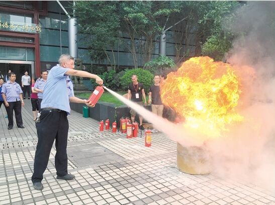 华博馆安保人员学习灭火器的使用方法,并进行模拟灭火操作。