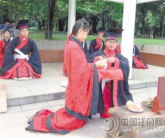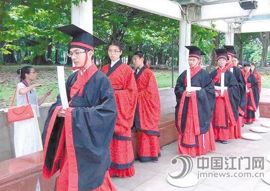 6月10日上午,18名汉服宣传志愿者聚集蓬江河边,身着汉服,双手作揖,以古代祭祀礼仪来祭奠屈原,成为釜山公园内有趣的一道风景,让围观的市民惊叹仿佛“穿越”回古代。
