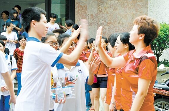教师穿红衣与考生击掌加油。