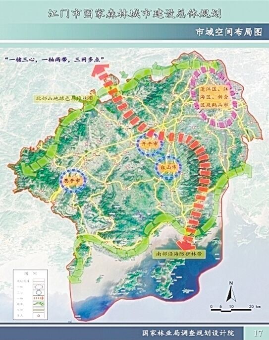 以“森林江门,美丽侨都”为建设理念,《总体规划》把江门划分为四大生态功能区,打造“一核三心、一轴两带、三网多点”,建设森林生态、生态文化、森林产业和森林支撑的四大体系,确保2018年成功“创森”,并在10年内投入约55亿元,分“三步走”把江门建成珠三角国家森林城市建设的典范,走出江门特色的国家森林城市建设之路。