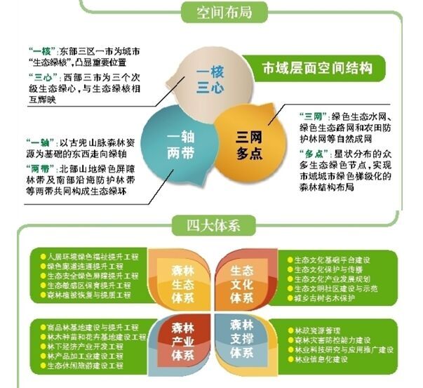 结合区域生态格局特征、生态环境差异及林业服务功能定位,《总体规划》还将我市划分为北部山地森林生态保护区、中部城乡农林生态发展区、南部丘陵台地生态保育区和海洋资源生态保护与开发区等四大生态功能分区,并在市域层面的空间布局中,打造“一核三心、一轴两带、三网多点”。