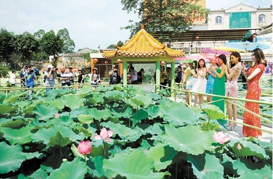 “荷花仙子”在荷花池里摆出造型,让游客与摄影爱好者拍摄。