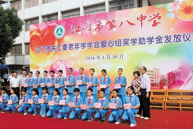 近日,江门八中隆重举行2016年江门市关工委老年学学会爱心组奖学助学金发放仪式。仪式上,江门八中校长陈兆伟代表学校,接受了爱心组关玉莲、郑月仙女士代表江门市关工委老年学学会爱心组捐赠的5万元支票,其中3.3万元将用于奖励黄钊亮等66位品学兼优的同学,每人500元;1.7万元用于资助该校17位家庭经济困难的学生,每人1000元。