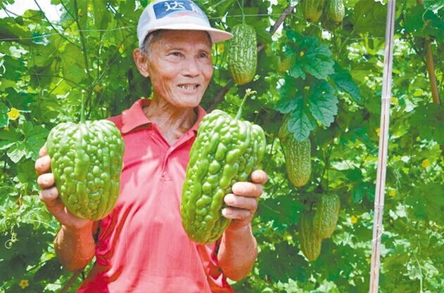 在凉瓜上市开摘仪式上,瓜农展示采摘的凉瓜。