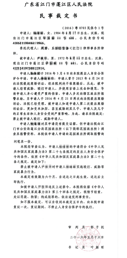 5月16日,蓬江区法院西区审判庭当庭裁定,对遭受丈夫家庭暴力侵害的妇女杨某实施人身安全保护。随后,法庭将人身安全保护令分别送达给双方当事人、当地居委会和派出所,该裁定自送达之日起6个月内有效。