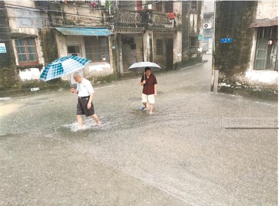 昨日早上,蓬江、江海两区普降暴雨,三小时内部分地区降雨量超过50毫米,江门预警中心发出暴雨橙色警报。受大雨影响,蓬江区江华里及江海区东宁路、高新西路等路段有水浸现象。 昨日早上,市民周先生报料,称水南路江华里57号附近水浸,并称该路段多年均是水浸黑点。记者在现场见到,江华里57号、58号一带是低洼地带,比附近地面低了近一米,路面积水约10公分,附近居民进出须蹚水。一楼的住户已经用木板、沙袋拦住门口,一名住户告诉记者:“这里去年也水浸过,当时半夜积水有30厘米深,深水至膝盖。” 根据蓬江区泵房排涝系统报告,昨日11时20分,共14个泵房开泵排水,12时左右,江华里57号附近积水已排完。 市民杨小姐报料,称高新区东宁路长期水浸。记者在东宁路见到,附近正在修建花圃,雨水把泥土冲到路面上,东宁路、高新西路一带都有水浸现象。高新西路33号处还有厂房水浸。几名市政抢险人员打开附近雨水井进行疏通,并用护栏围起雨水井。至记者下午离开时,得发路路面一带还有积水。 另外,记者从蓬江区城管局获悉,台风雨季节已到,该局市容股向江门市户外广告行业协会发出通知,要求其迅速组织各户外广告发布单位对各自设置、管理的户外广告牌(铁架、灯具、电源等设施)进行安全检查,发现问题要及时维修、加固,切实做好台风季节和汛期的安全生产工作,保障人民群众生命财产安全。 资料来源:江门日报 |