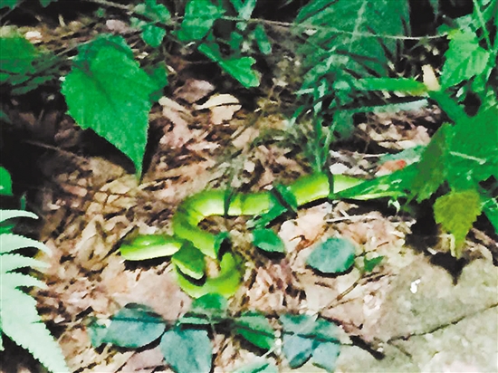 市民在元宝山体育公园,拍到路边草丛里的青竹蛇。
