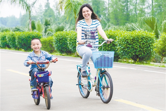 一对参加骑行的母子好开心。