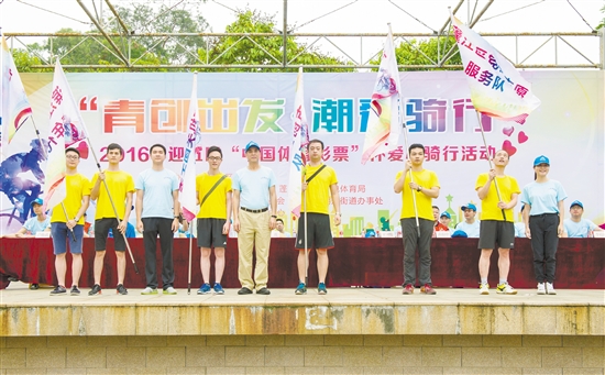 领导嘉宾为骑行队伍授旗。