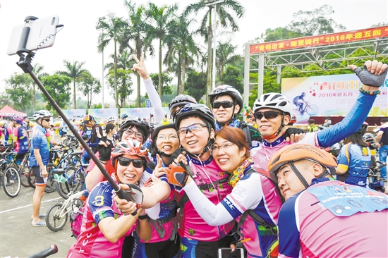 一支骑行小分队在玩自拍。