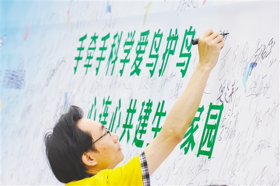 参加骑行活动的骑行者在签名。
