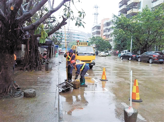 蓬江区市政设施维修处工作人员在建达南路清疏“水浸黑点”。