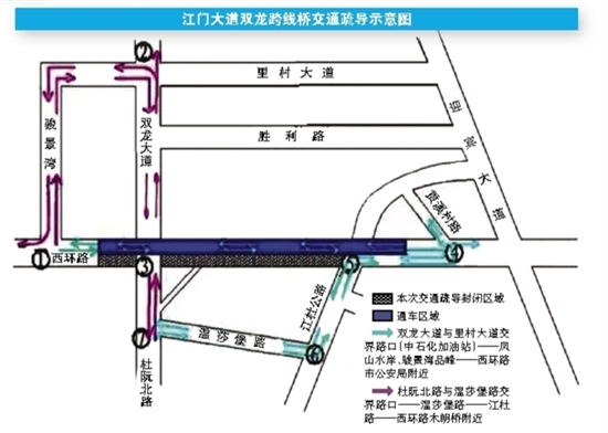 具体绕行路线为:如果属北行的车辆(往市公安局、碧桂园、鹤山、广州方向),从双龙大道与里村大道交界路口(中石化加油站)出发,经过凤山水岸、骏景湾品峰,最终在市公安局附近进入西环路;如果属南行的车辆(往木朗、龙湾、新会方向),从杜阮北路与温莎堡路交界路口出发,经温莎堡路进入江杜公路,来到木朗桥附近进入西环路。