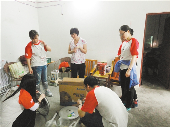 志愿者们送上风扇后帮忙安装。