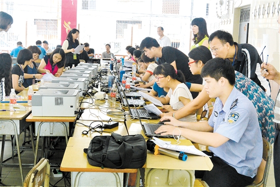 每年新生报名都要经过严格的资料审核。图为去年蓬江区一年级新生补报名资料审核现场。