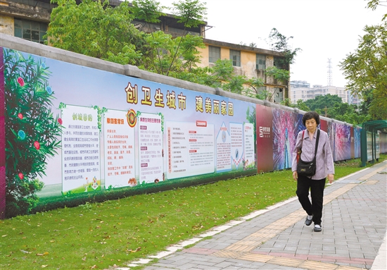 在蓬江区天宁路、珠江帝景湾正门一侧,有一处破旧的建筑群,其围墙上贴上了“创卫生城市 建美丽家园”的大幅宣传画,给人耳目一新的感觉。