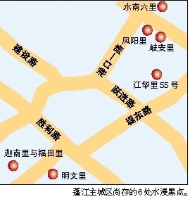 据蓬江区城管局介绍,目前蓬江主城区还有6个水浸黑点,分别位于凤阳里、水南六里、岐安里、迦南里与福田里、明文里、江华里55号。蓬江区城管局针对此6个水浸黑点分别制定了水浸应急预案、日常巡查清疏方案及安排了排水责任人,并将水浸黑点情况整理成册,根据财力实际情况编制维修改造方案进行逐步整治和向各主管部门提供参考依据。