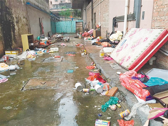 整治前的杏苑社区金都花园4幢巷道,垃圾满地。