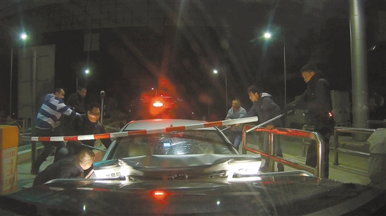 嫌疑车辆准备通过滨江收费站时,民警驾驶车辆进行前后夹击,将车上5名犯罪嫌疑人控制。 (图片为抓捕过程视频截图)