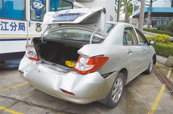 被用来作案的粤X号牌车辆,其车头及车尾在警方抓捕行动中损毁,可见抓捕过程的激烈程度。