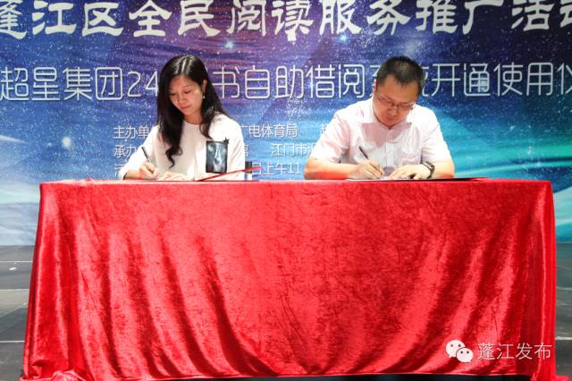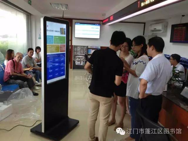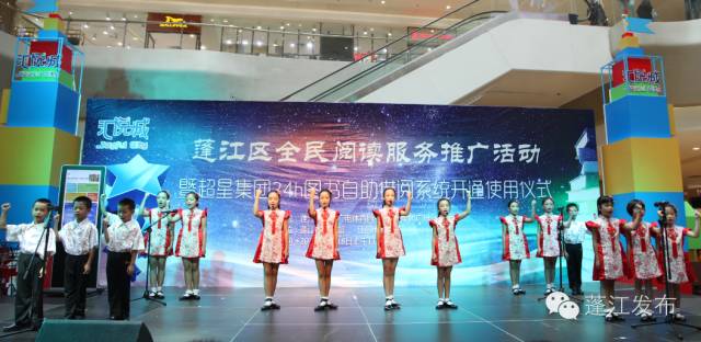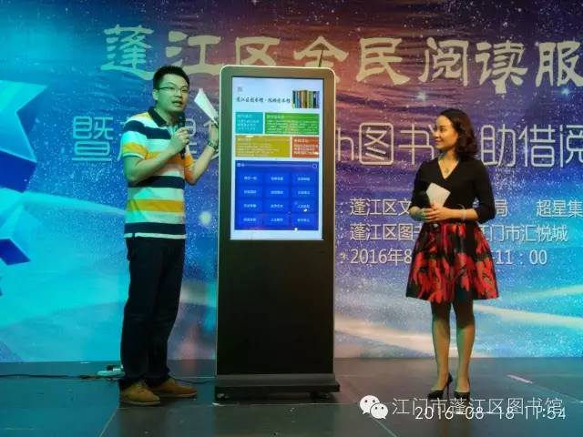 18日早上,蓬江区全民阅读服务推广活动-暨超星公司24h图书自助借阅系统开通使用仪式在汇悦城一楼大堂隆重举行,仪式后新增的4台电子借阅机已经投放到位,可以使用啦!