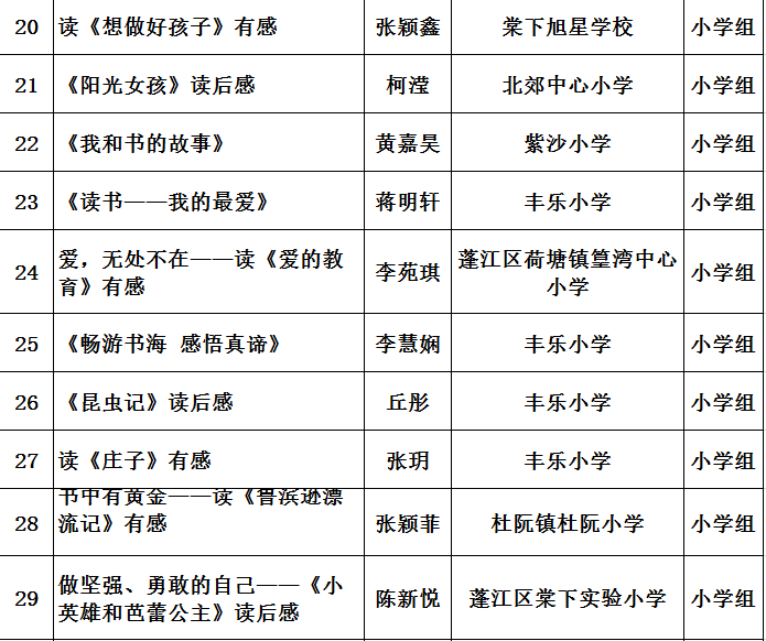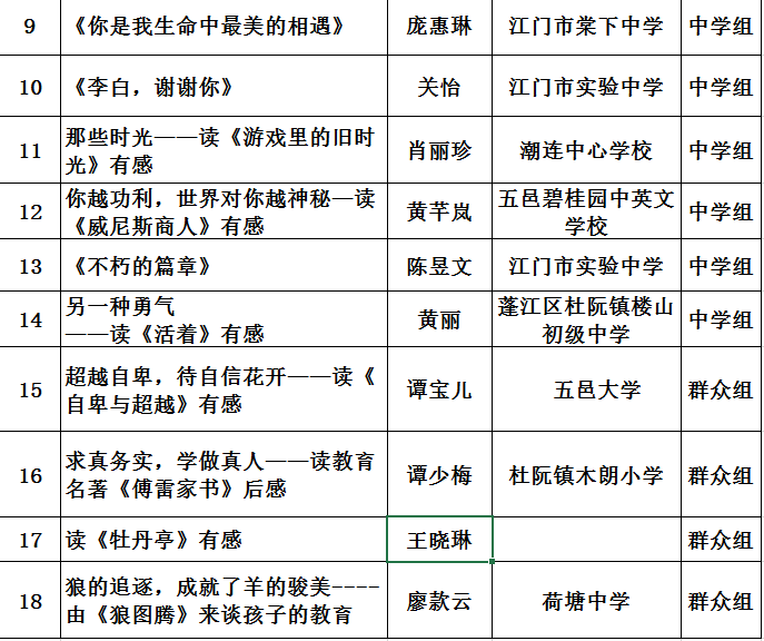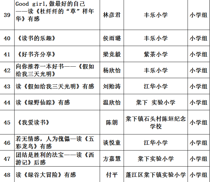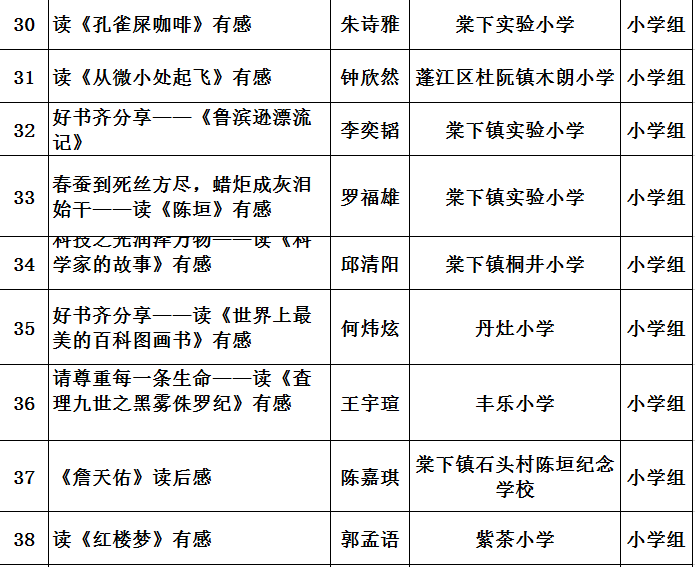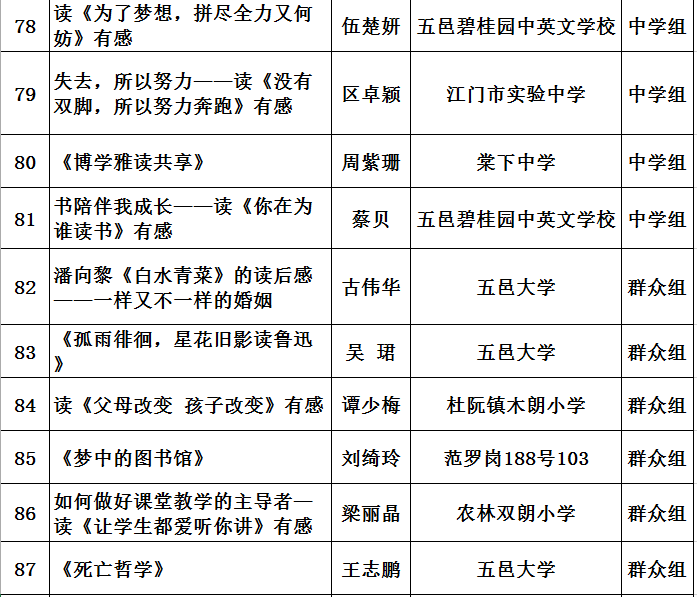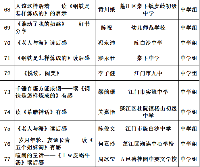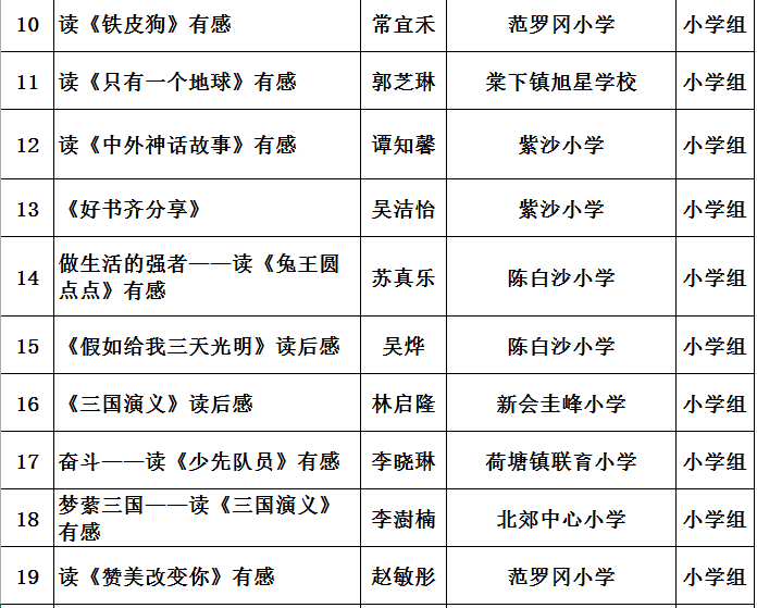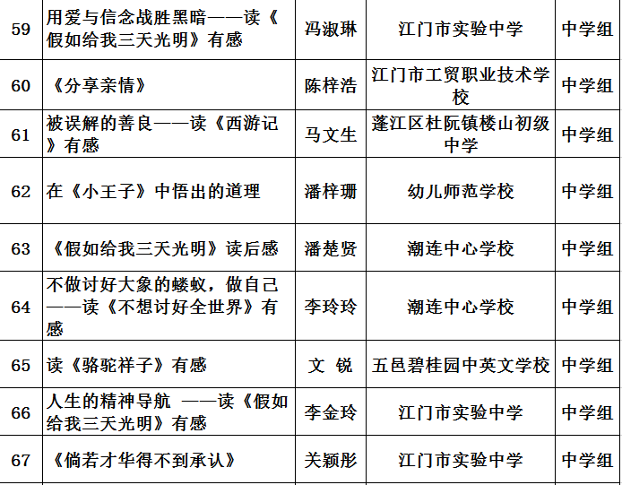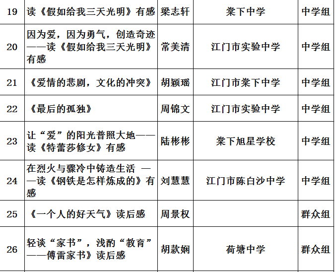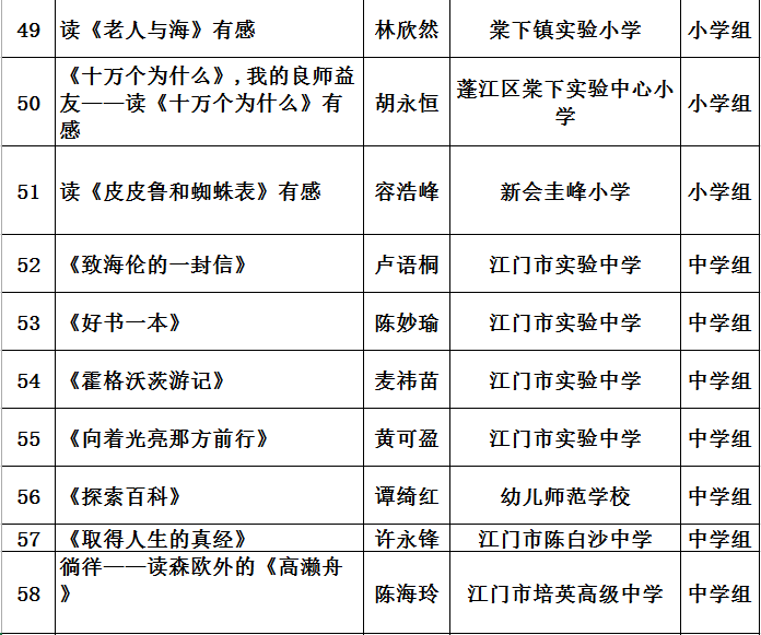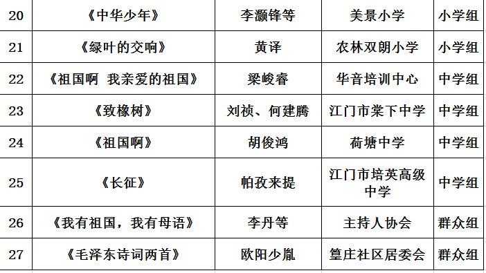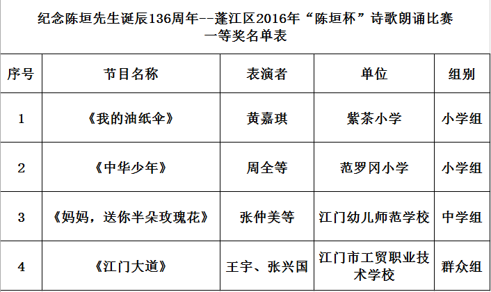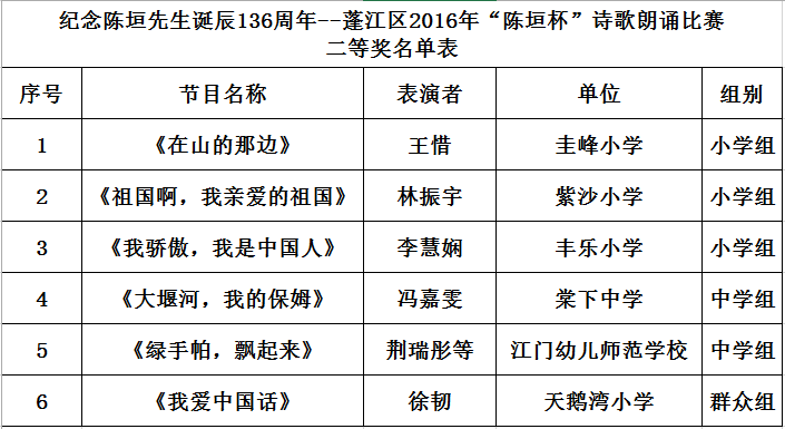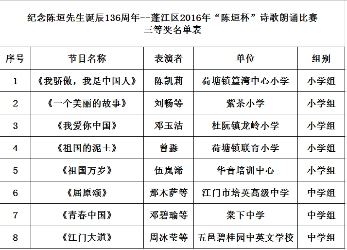 蓬江区紫茶小学、蓬江区范罗冈小学、蓬江区丰乐小学、蓬江区紫沙小学、蓬江区荷塘镇联育小学、蓬江区荷塘镇篁湾中心小学、蓬江区杜阮镇龙岭小学、江门市棠下中学、江门幼儿师范学校、江门市培英高中、蓬江区农林小学、蓬江区荷塘镇禾冈小学、蓬江区杜阮镇木朗小学、蓬江区荷塘镇良山小学、蓬江区棠下镇石头村陈垣纪念学校、蓬江区江华小学、蓬江区丰雅社区、蓬江区丰乐小学、蓬江区荷塘镇三良小学、蓬江区农林双朗小学、蓬江区培英小学、蓬江区陈白沙中学、蓬江区荷塘中学、潮连中心学校、江门市工贸职业技术、蓬江区主持人协会、江海区天鹅湾小学、五邑碧桂园中英文学校、江门市华音培训中心、新会景堂图书馆、江门市实验中学、杜阮镇楼山初级中学、棠下镇虎岭初级中学、棠下镇周郡小学、棠下旭星学校、杜阮镇杜阮小学、棠下镇实验小学、棠下镇桐井小学、蓬江区丹灶小学、棠下镇横江小学、荷塘镇良山小学、杜阮镇贯溪小学、棠下镇中心小学、蓬江区北苑小学、荷塘镇白藤小学、蓬江区陈白沙小学、蓬江区发展小学、蓬江区美景小学、蓬江区北郊中心小学